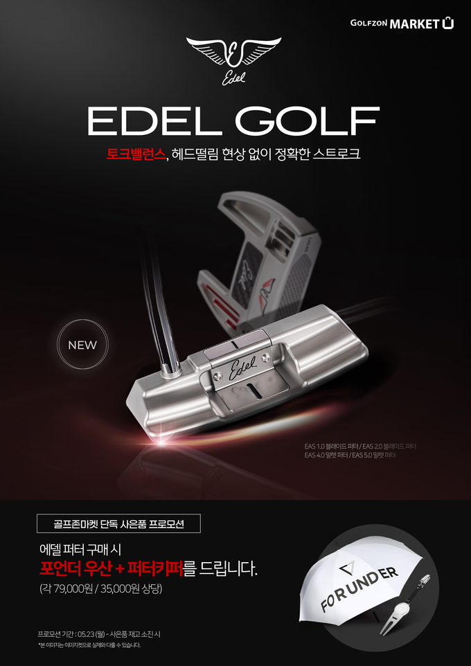 구매 프로모션도 진행된다. 에델 EAS 블레이드 퍼터 구매 시 골프존마켓 단독 사은품인 약 8만 원 상당의 포언더 골프우산과 약 3만 원 상당의 퍼터키퍼가 제공돼 주목할 만하다.