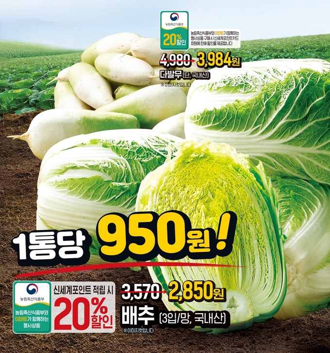 이마트는 2023 김장대전 기간 동안 배추 1망(3포기)을 2850원에 판매한다. 이는 이마트가 자체적으로 준비한 행사가(1망 3570원)에서 농림축산식품부와 손잡고 신세계포인트 적립 시 20%를 추가로 더 할인(1망 2850원)해 주는 방식이다.