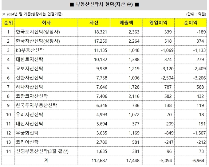 2024년 말 기준 각 사 (연결)사업보고서·감사보고서에 따르면 14개 신탁사 매출액(영업수익)은 1조7448억원을 기록했다. 영업이익과 당기순이익은 각각 5094억원, 6964억원 적자를 내며 수익성이 크게 악화됐다. 수년째 이어진 부동산 경기 침체의 여파가 고스란히 반영된 결과다.