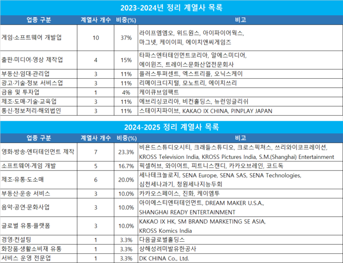 2년간의 정리 추이를 통합해 보면 카카오는 게임·소프트웨어 개발업(26.3%), 제조·유통·도소매업(22.8%), 영화·방송·엔터·미디어 제작업(19.3%) 부문의 계열사를 가장 많이 정리했다.