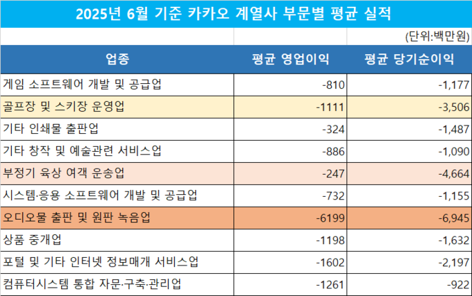 기업집단현황 공지자료를 기반으로 남아 있는 계열사의 평균 손익을 계산한 결과 미디어·엔터테인먼트 부문과 운송 부문의 수익성이 가장 낮은 것으로 나타났다. 특히 ‘오디오물 출판 및 원판 녹음업’의 평균 당기순손실은 약 69억4500만원, ‘부정기 육상 여객 운송업’은 약 46억6400만원의 당기순손실을 기록하고 있다. 골프장 및 스키장 영업 부문도 약 35억원의 당기순손실을 기록하면서 뒤를 이었다.