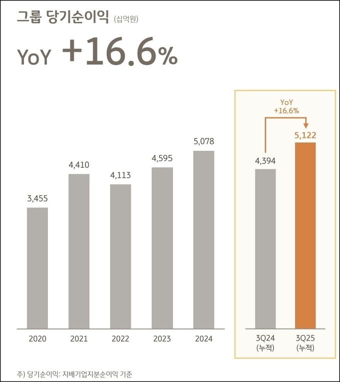 3분기 누적 당기순이익은 5조1217억원, 3분기 누적 ROE는 12.78%를 기록했다. 특히 순수수료이익이 전년동기 대비 3.5% 확대되는 등 그룹의 핵심 이익이 양호한 흐름을 보이며 안정적인 실적을 시현했다는 설명이다.