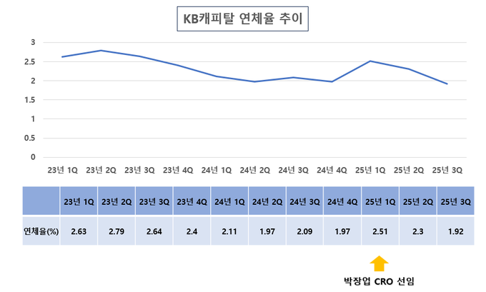 박 CRO 선임 이후 연체율이 빠르게 낮아지고 있는 점은 긍정적인 신호로 평가된다. 지난해 1분기 이후 연체율은 2% 중반에서 1%대 후반까지 내려오며 단기적인 개선세를 보이고 있다. 우량자산 유입 확대를 목표로 한 상품별 심사 전략 정교화와 회수 전략, 상각·매각을 병행한 연체채권 관리가 가시적인 성과로 이어지고 있다는 평가다.