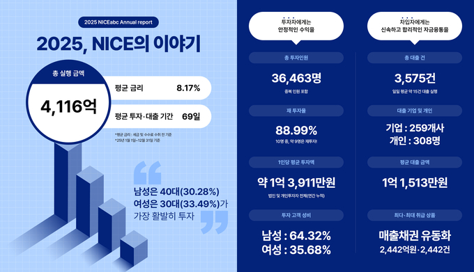 이번 리포트는 2025년 한 해 동안 나이스abc를 통해 투자 및 대출이 이뤄진 상품과 고객들의 데이터를 바탕으로 분석했다. 리포트에 따르면 나이스abc는 2024년 대비 약 20.2% 성장하며 연간 4116억원의 취급액을 달성했다. 대출잔액은 2024년 대비 약 119.3% 성장하며 괄목할 성장을 보였다. 총 누적 취급액은 1조7568억원을 돌파하며 경기 불확실성이 지속되는 환경 속에서도 중소·중견기업들의 자금 유동성 확보에 큰 기여를 한 것으로 나타났다.