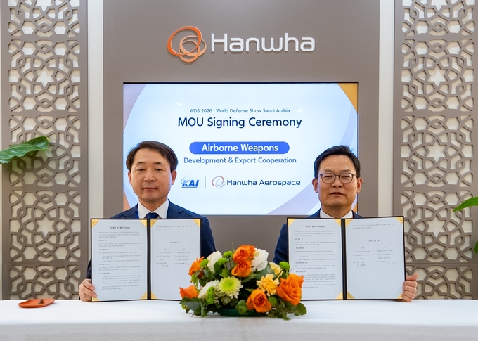 한화에어로스페이스는 KAI와 9일(현지시간) 사우디아라비아 리야드에서 열린 제3회 세계방산전시회(WDS)를 계기로 ‘항공무장 사업협력 업무협약(MOU)’을 체결했다고 10일 밝혔다. 한화 부스에서 열린 MOU 체결식에는 손재일 한화에어로스페이스 대표이사, 차재병 KAI 대표이사 등 양사 주요 관계자들이 참석했다.