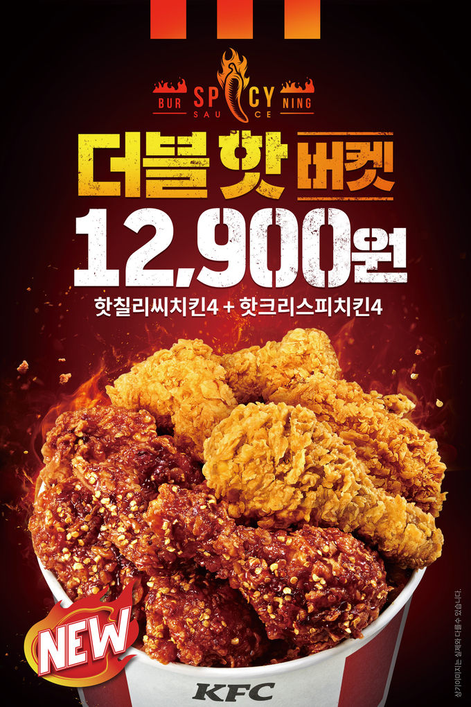 ‘더블핫버켓’은 지난 27일 새롭게 선보인 ‘핫칠리씨치킨’ 4조각과 KFC의 시그니처 메뉴 ‘핫크리스피치킨’ 4조각, 총 8조각을 한번에 맛볼 수 있는 제품으로 1만2900원에 만나볼 수 있다.