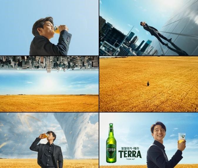 도심의 빌딩 숲, 모델 공유가 청정라거-테라를 마시는 순간 광활하고 청정한 보리밭으로 이동하고, 동시에 보리밭에는 춤을 추듯 거대한 회오리가 일면서 그대로 청정라거-테라 토네이도 병 안으로 빨려들어간다.