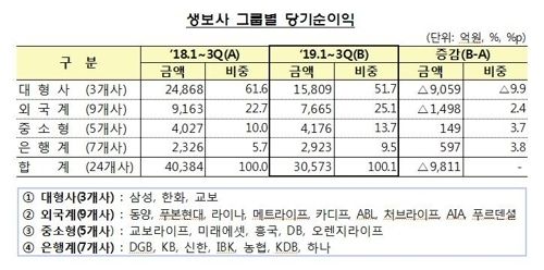금융감독원이 1일 발표한 '1∼3분기 생명보험사 경영실적(잠정)' 자료를 보면 생명보험사의 당기순이익은 3조573억원으로 지난해 같은 기간(4조384억원)에 견줘 24.3%(9811억원) 급감했다.