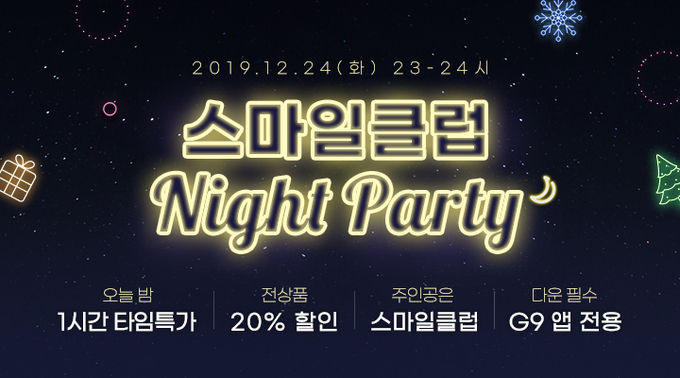 12월 24일에 열리는 11번째 ‘나이트파티’에서는 크리스마스 이브를 맞아 전 상품(일부 이벤트상품 제외)에 최대 24% 할인 혜택을 제공한다. G9 어플리케이션을 통해 쇼핑하고, 3대 카드(KB국민/NH농협/BC카드)를 활용해 결제 시 최대 5000원까지 할인 가능하다.