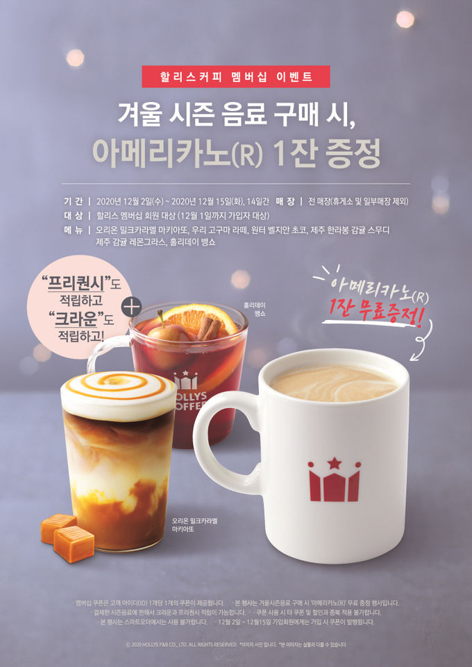 이번 프로모션은 연말을 맞아 할리스커피가 한 해 동안 받은 소비자들의 사랑에 감사의 마음을 전하고자 기획됐다. 멤버십 회원을 대상으로 오는 15일까지 14일간 진행되며, 겨울 시즌음료를 구매하는 소비자에게 아메리카노(R) 한 잔을 무료로 증정한다. 해당 멤버십 쿠폰은 할리스커피 앱 MY쿠폰에서 확인할 수 있다.