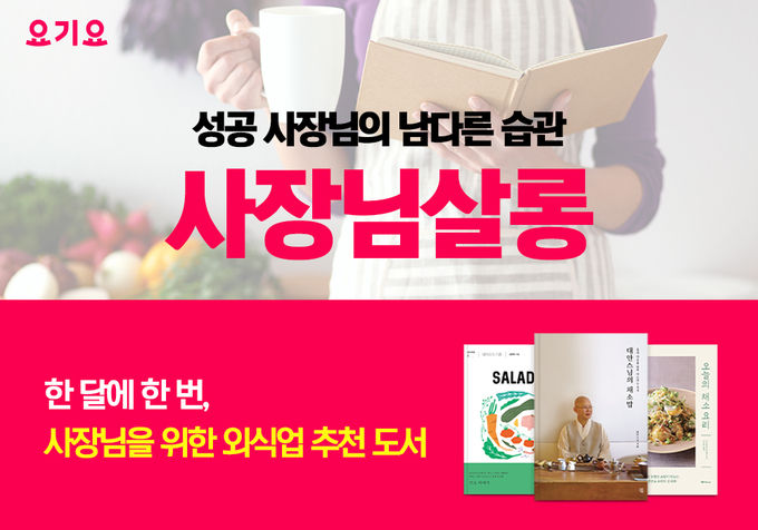 이달의 ‘요기요 사장님살롱’ 주제는 ‘채소요리’로 코로나19로 인해 건강에 대한 관심이 고조되는 만큼 주목받고 있는 다양한 채식 트렌드를 담았다. 선정 도서는 ▲대안스님의 채소밥 ▲샐러드의 기초 ▲오늘의 채소 요리 등 총 3권으로, 특별한 지식이 없더라도 책을 통해 쉽게 따라 할 수 있는 유용한 채소 요리 레시피와 재료 손질 정보를 담은 책을 선정했다.