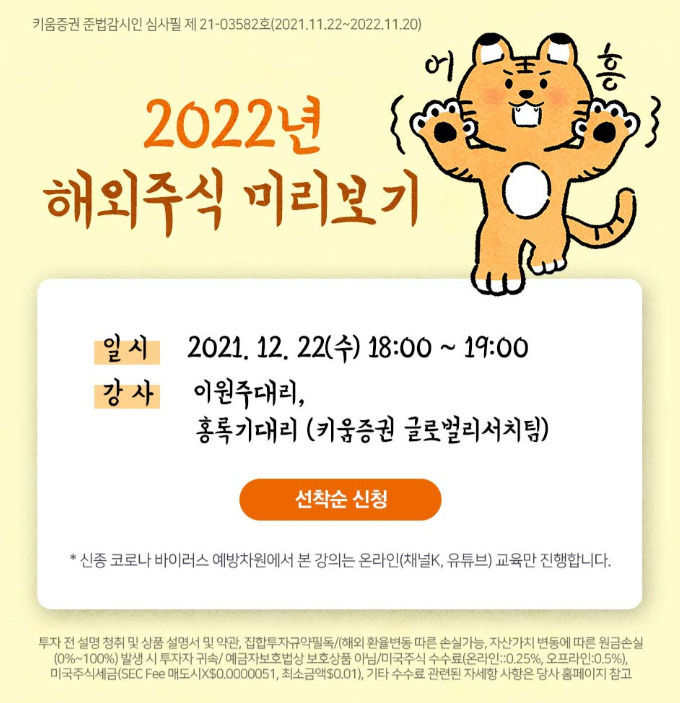 [FETV=성우창 기자] 키움증권은 오는 22일 18시부터 60분간 2022년 해외증시 전망 세미나를 개최한다고 21일 밝혔다.