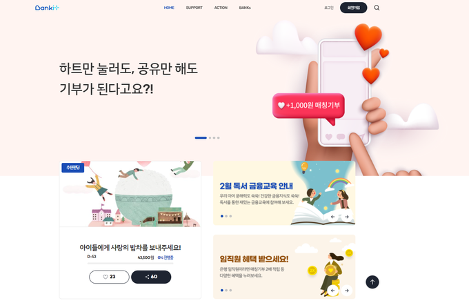 뱅크잇은 '은행을 통해 나눔을 잇다'라는 의미다. MZ세대(1980년~2000년 초반 출생) 기부 트렌드와 언택트(비대면) 시대에 적합한 로 디지털 기반 사회공헌 플랫폼을 지향한다.