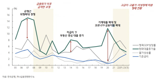 하나금융경영연구소는 가계부채(2011년 916조원 →2022년 6월 1869조원)와 한계기업(2011년 2064개 →2022년 6월 3572개), 부동산PF(2011년 51조원 →2022년 6월 112조원) 등 저금리 시대에 누증된 취약성이 고금리에 따른 이자부담 증가와 부동산 경기 악화 등으로 표면화될 가능성이 높으므로 적극적인 리스크관리가 필요하다고 진단했다. 특히, 비은행업권은 취약계층과 자영업 다중채무자, 지방 건설사업장 등의 부실이 우려된다.