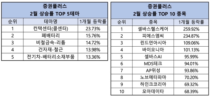 [FETV=심준보 기자] 두나무는 국민 증권 애플리케이션 증권플러스에서 지난 2월 한 달간 ‘컨택센터(콜센터)’와 ‘셀바스헬스케어’가 각각 상승률 1위 테마와 종목에 올랐다고 7일 발표했다.