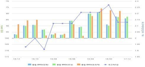 12월 채권시장지표(BMSI:Bond Market Survey Index)는 종합지표가 96.7로 전달(89.6)보다 7.1포인트 상승했다.