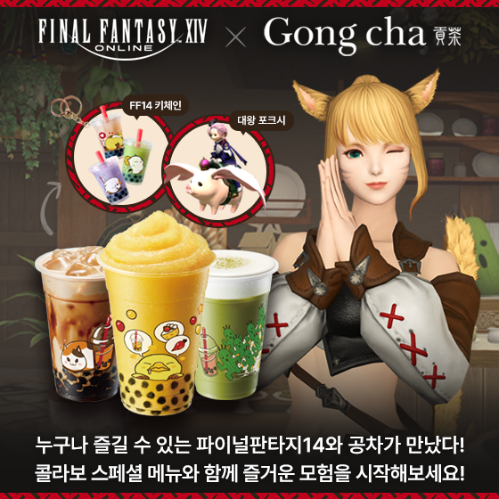 프로모션 기간 동안 공차 매장을 방문해 ‘뚱냥이 브라운슈가 쥬얼리 밀크티’, ‘뚱보초코보 망고 스무디+펄’. ‘사보텐더 제주 그린 스무디’ 등 3종으로 구성된 콜라보 스페셜 메뉴를 구매하면 ‘파이널판타지14’의 꼬마친구 캐릭터 ‘뚱냥이’, ‘뚱보초코보’, ‘사보텐더’가 인쇄된 콜라보 스페셜 컵을 제공한다.