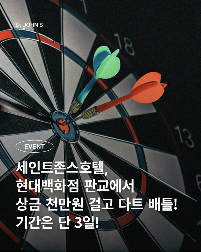 호텔 관계자는 “이번 다트 이벤트는 세인트존스호텔만의 재미와 과감한 혜택을 동시에 담은 특별한 도전”이라며, “강릉을 대표하는 호텔이 판교에서 선보이는 이색 콘텐츠인 만큼, 많은 분들이 참여해 잊지 못할 경험을 하시길 바란다”고 전했다.