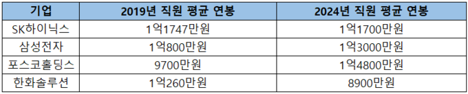 SK하이닉스의 1인당 평균 급여는 2019년 1억1747만원에서 2024년 1억1700만원으로 소폭 줄었다. 업계 관계자는 “2024년 급여에는 2023년도 성과급이 사실상 반영되지 않아 감소한 것”이라고 설명했다.