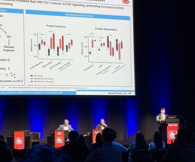 한미약품 관계자는 “EASD 연구 발표는 임상 1상 진입을 앞둔 HM17321의 약리적 효능이 인체에서도 재현될 가능성을 과학적으로 입증한 의미 있는 성과”라며 “‘지방 감량+근육 증가+운동 및 대사 기능 개선’이라는 양질의 체중 감량 효능을 동시에 지향하는 HM17321은 향후 비만 및 근감소 동반 대사질환 치료 분야에서 ‘계열 내 최초 신약(First-in-Class)’으로 자리매김할 수 있을 것으로 기대한다”고 말했다.