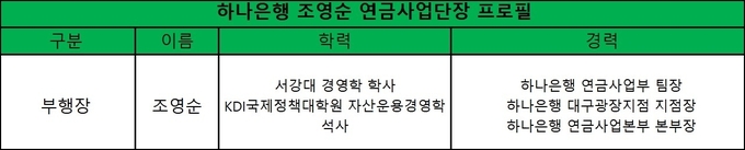 연금사업단장은 조영순 부행장이 맡아오고 있다. 조 부행장은 독립조직으로 분리된 지난해부터 연금사업단을 지휘하고 있다. 조 부행장의 경력은 연금사업에 집중돼 있다. 그는 하나은행에서 연금사업부 팀장, 대구광장지점 지점장, 연금사업본부 본부장 등을 역임했다.