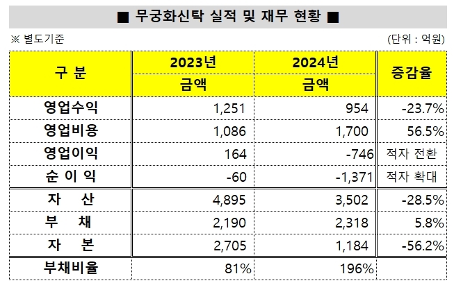 현재 무궁화신탁의 상황은 녹록지 않다. 2024년 말 별도기준 영업수익은 954억원으로 다시 1000억원대 이하로 떨어졌고 수익성지표도 영업손실 746억원을 내며 적자전환했다. 안정세를 유지해왔던 부채비율도 196%를 기록하며 재무 부실 기준인 200%에 근접했다.