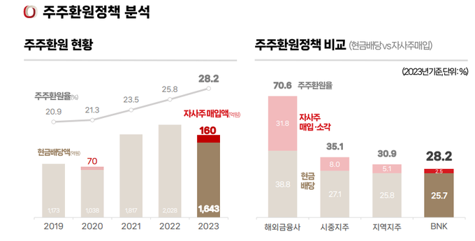 이 같은 목표는 국내 금융지주 대비 낮은 환원율을 글로벌 수준으로 끌어올리겠다는 의지에서 비롯됐다. 실제로 2023년 기준 BNK금융의 주주환원율은 28.2%로 해외 금융사 평균(70.6%)의 절반에도 못 미친다. 4대 금융지주(35.1%)나 지방금융지주(30.8%)보다도 낮은 수준이다.
