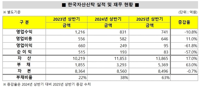 한국자산신탁은 부동산 경기 악화 영향으로 가까스로 흑자를 유지했다. 2025년 별도기준 상반기(누적) 영업수익은 741억원, 영업이익은 95억원을 기록했다. 전년 동기와 비교해 영업수익은 10.8%, 영업이익은 61.8% 감소했다. 당기순이익도 83억원으로 전년 동기(193억원) 대비 57.0% 감소했지만 14개 신탁사 중 절반이 적자를 기록한 상황을 감안하면 비교적 선방했다는 평가도 나온다.