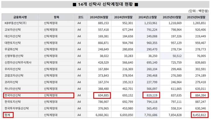 지난해부터 급증하던 신탁계정대도 올해 들어 증가폭이 둔화됐다. 2024년 6월 말 6049억원이던 신탁계정대는 2025년 6월 말 8844억원으로 증가했지만 속도는 점차 완화되고 있다.