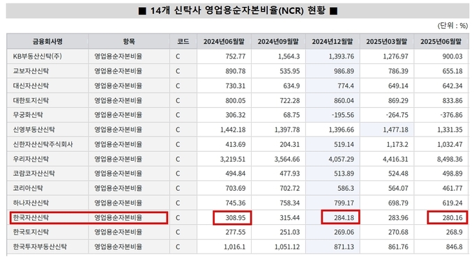 반면, 영업용순자본비율(NCR)은 같은 기간 308%에서 최근 280% 수준으로 하락했다. 업계 관계자는 한국자산신탁이 업계 상위권의 자본력을 갖추고 있음에도 불구하고 자회사 출자와 부동산펀드 투자 등 신탁사업 외 재무 부담이 지속되면서 경쟁사 대비 NCR이 낮은 편이라고 분석했다.