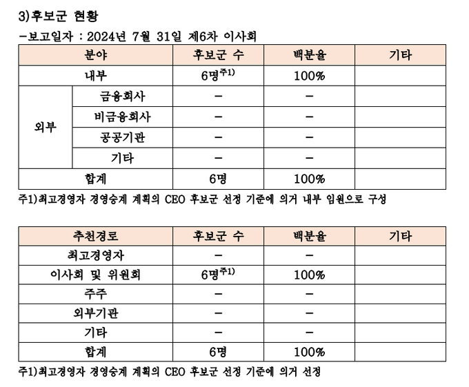 이와 관련해 이사회 사무국은 최고경영자 상시 후보군을 선정해 관리하고 있으며 이 후보군에 포함되지 않은 인사는 지원 자체가 불가능하다고 설명했다. 이는 과거 낙하산 인사나 충분한 검증·육성이 이뤄지지 않은 후보가 갑자기 영입되면서 발생했던 폐해를 막기 위한 조치라는 것이다. 해당 제도는 국내 모든 금융지주사에 공통적으로 적용되고 있다.