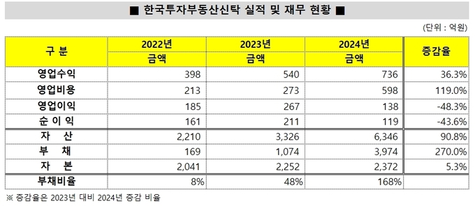 이처럼 한국투자부동산신탁은 수년 간 외형 확장에는 성공했지만 지난해 이익은 결국 반토막나고 말았다. 2024년 약정보수 기준 624억원을 수주하며 전년(406억원) 대비 53.7%의 수주 증가율을 기록했다. 이에 따라 영업수익은 전년 대비 36.3% 증가한 736억원에 달하며 성장세를 이어갔다.