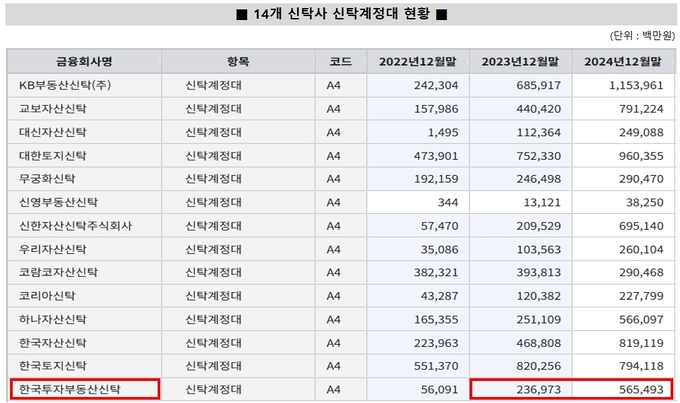 이에 한국투자부동산신탁은 위험도가 높은 책준형 신탁은 사실상 동결하고 차입형 신탁 중심으로 전략을 전환했다. 2021년 235억원 수준이던 책준형 신탁 수주는 2023년 이후 연간 28억원 수준으로 대폭 축소됐다. 대신 차입형 신탁 수주는 같은 기간 279억원에서 441억원으로 증가했다.