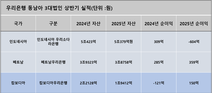 지난해 적자였던 캄보디아 우리은행이 흑자전환에 성공하며 실적 회복 기대감을 높이고 있다. 올 상반기 순이익은 150억원을 기록했다. 동남아 3대 법인으로 꼽히는 인도네시아·베트남에 비해 순이익 기여도는 아직 낮지만 광범위한 영업망을 바탕으로 현지 시장 공략에 속도를 내고 있다. 자산 규모가 상대적으로 작은 만큼 성장 여력도 그만큼 크다는 평가다.
