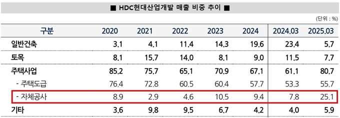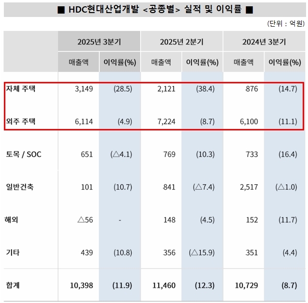 ‘자체 주택(공사)’는 2021년과 2022년 총매출액의 5% 미만을 차지했으나 2023년부터 10%대를 넘어섰고 2025년 3분기에는 그 비중이 30.3%로 확대됐다. 매출 비중 확대와 더불어 이익률도 외주주택(4.9%)이나 일반건축(10.7%), 토목/SOC(-4.1%) 등과 비교해 월등히 높은 28.5%를 달성했다.