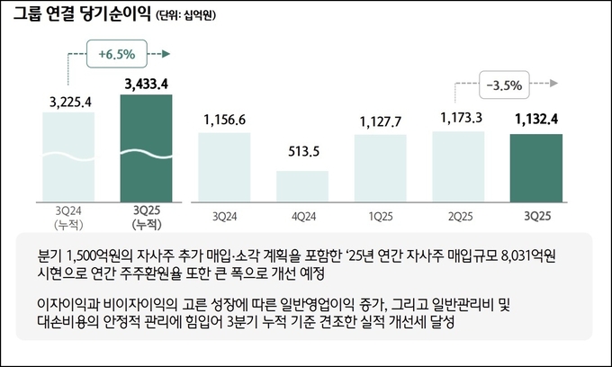 그룹의 핵심이익은 이자이익 6조7803억원과 수수료이익 1조6504억원을 합한 8조4307억원으로 전년 동기 대비 3.8% 증가했으며, 3분기 순이자마진(NIM)은 1.74%이다.