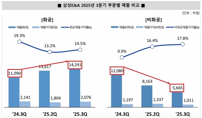 30일 삼성E&A 실적 공시에 따르면 올해 3분기 매출은 1조9956억원, 영업이익은 1765억원을 기록했다. 매출과 영업이익이 전년 동기 대비 각각 13.9%, 13.4% 감소했다. 화공 부문은 매출 약 1조4000억원으로 전년 동기 대비 28.9% 증가한 반면, 비화공 부문은 매출 약 6000억원으로 같은 기간 53.1%나 감소했다. 비화공 부문 매출 둔화가 수익성 악화의 주요 원인으로 꼽힌다.