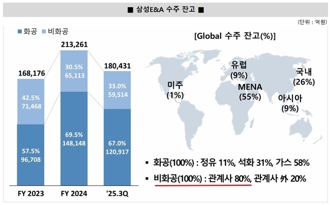 삼성E&A의 비화공 부문은 그동안 그룹사 일감에 크게 의존해왔다. 올해 상반기 기준 삼성E&A의 對 삼성전자 매출은 1조896억원으로 전체 매출 4조2760억원의 25.48%를 차지했다. 삼성바이오로직스의 경우 2354억원으로 5.5% 수준이었다. 삼성전자와 삼성바이오로직스 등 삼성 그룹사 전체의 매출 비중은 약 31% 수준이다.