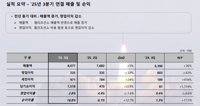 매출은 전년 동기 대비 26% 증가했지만 영업이익은 전년 동기 대비 63% 감소했다. 한화시스템은 필리조선소 매출액 반영으로 매출이 증가하는 동시에 필리조선소 투자 관련 일회성 비용 388억원 발생으로 영업이익이 감소했다고 설명했다. 당기순이익의 경우 세액공제가 반영되며 전년 동기 대비 1774%로 급증했다고 밝혔다.
