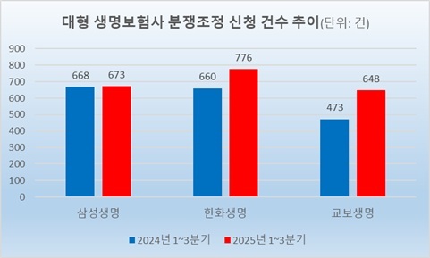 6일 생명보험협회에 따르면 삼성생명, 한화생명, 교보생명 등 3개 대형 생보사의 올해 1~3분기(1~9월) 분쟁조정 신청 건수(중·반복 제외)는 2097건으로 전년 동기 1801건에 비해 296건(16.4%) 증가했다.