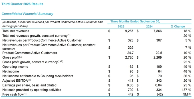 [FETV=김선호 기자] 국내 쿠팡의 모기업 쿠팡Inc가 올 3분기 12조8000억원대의 매출을 거두며 전년 동기 대비 20% 성장세를 이어갔다. 대만 로켓배송 등 성장사업 부문 매출이 31% 고속성장하며 글로벌 사업 호조가 실적을 견인한 것으로 나타났다.