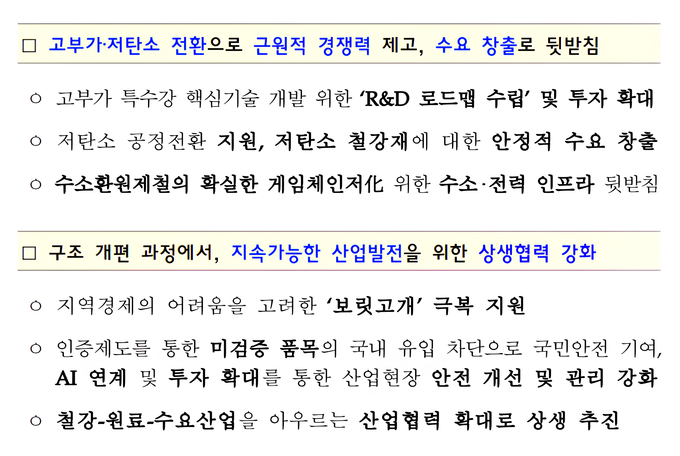 정부는 이번 철강산업 고도화 정책을 단순한 감산이 아닌 ‘산업 생태계 전환’으로 규정했다. 저탄소 철강 인증제 도입과 AI 기반 공정 효율화, 철스크랩 산업 육성 등 후속 대책도 병행될 예정이다. 정부는 “철강산업이 구조적 위기의 초입 단계에 있다”며 “공급과잉 품목의 조정을 계기로 고부가·저탄소 산업으로 근본적 구조 전환의 골든타임”이라고 밝혔다.