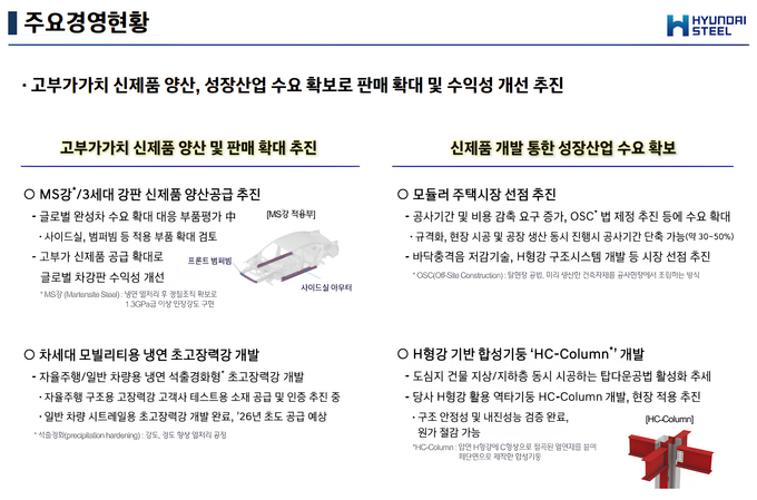 현대제철도 EU의 환경 규제 강화에 맞춰 저탄소 생산체계 전환에 속도를 내고 있다. 김원배 현대제철 부사장은 3분기 컨퍼런스콜에서 "EU 탄소국경조정제도(CBAM)에 대응하기 위해 배출량 측정·보고 시스템을 조기 구축했다"고 언급하기도 했다. 여기에 MS강과 차세대 차량용 냉연 초고장력강 등 고부가 신제품의 양산과 판매 확대를 통해 수익성 개선을 추진하겠다는 목표를 세웠다.