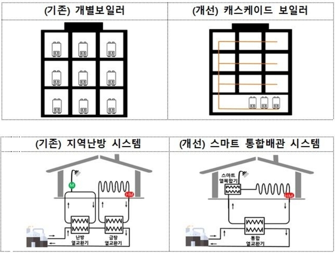 우선 개별난방 구조에는 '캐스케이드 보일러' 시스템을 적용한다. 이는 건물 내 기계실에 여러 대의 보일러를 집약 설치한 뒤 필요한 만큼의 열만 자동으로 생산하는 중앙집중형 고효율 구조다.