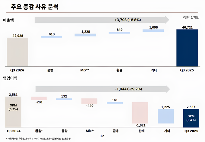 고율 관세 충격은 실적에 즉각 반영됐다. 현대자동차 3분기 연결기준 매출은 46조7210억원으로 전년 대비 8.8% 증가했지만 영업이익은 2조5370억원으로 전년 대비 29.2% 감소했다. 기아자동차 역시 연결기준 매출은 28조6860억원을 기록해 전년 대비 8.2% 증가했지만 영업이익은 1조4620억원으로 전년비 49.2%로 대폭 감소했다. 영업이익률도 양사 모두 8% 이상을 기록했던 전년 동기 대비 올해 3분기에는 5%대에 머물며 수익성이 약화됐다.