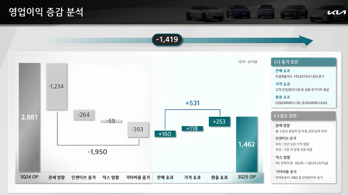 김승준 기아자동차 재경본부장 전무는 최근 3분기 실적발표 컨퍼런스콜에서 “실제 영향 관세 인하 영향은 12월부터 이어질 전망"이라며 "본격적인 실적 영향은 내년부터 가시화될 것"이라고 설명했다. 향후 실적 상승 여력은 충분하다는 분석이다.