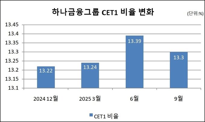 하나금융그룹(이하 하나금융) 실적발표 자료에 따르면 하나금융의 3분기 보통주자본(CET1) 비율은 13.30%로, 전분기 대비 0.09%p 하락했다.