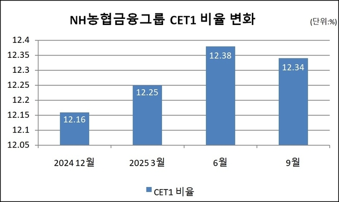 NH농협금융그룹(이하 농협금융)에 따르면 농협금융의 3분기 CET1 비율은 12.34%로, 전분기 대비 0.04%p 하락했다.