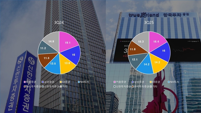 점유율 측면에서도 변화가 나타났다. 리테일 강자로 꼽히는 키움증권은 수탁수수료 자체는 증가했지만 점유율은 지난해 3분기 19.1%에서 올해 3분기 16.4%로 하락했다. 반면 △KB증권 13.8%→14.2% △NH투자증권 13.5% →14.2% △신한투자증권 11.5%→11.8%로 전반적인 오름세를 보였다. 특히 신한투자증권은 올해 1분기까지만 해도 6위였지만 2분기부터 한국투자증권을 제치고 5위로 올라섰다.