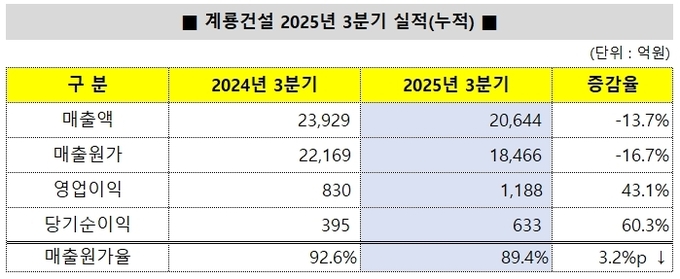 계룡건설의 실적은 ‘축소된 외형·개선된 이익’으로 요약된다. 올해 3분기 누적 매출은 2조644억원으로 전년 대비 13.7% 줄었지만 같은 기간 영업이익은 1188억원(+43.1%), 당기순이익은 633억원(+60.3%)으로 증가했다. 분기 실적 역시 3분기 매출 6617억원(-10.9%), 영업이익 387억원(+49.4%)으로 개선 흐름을 이어갔다.